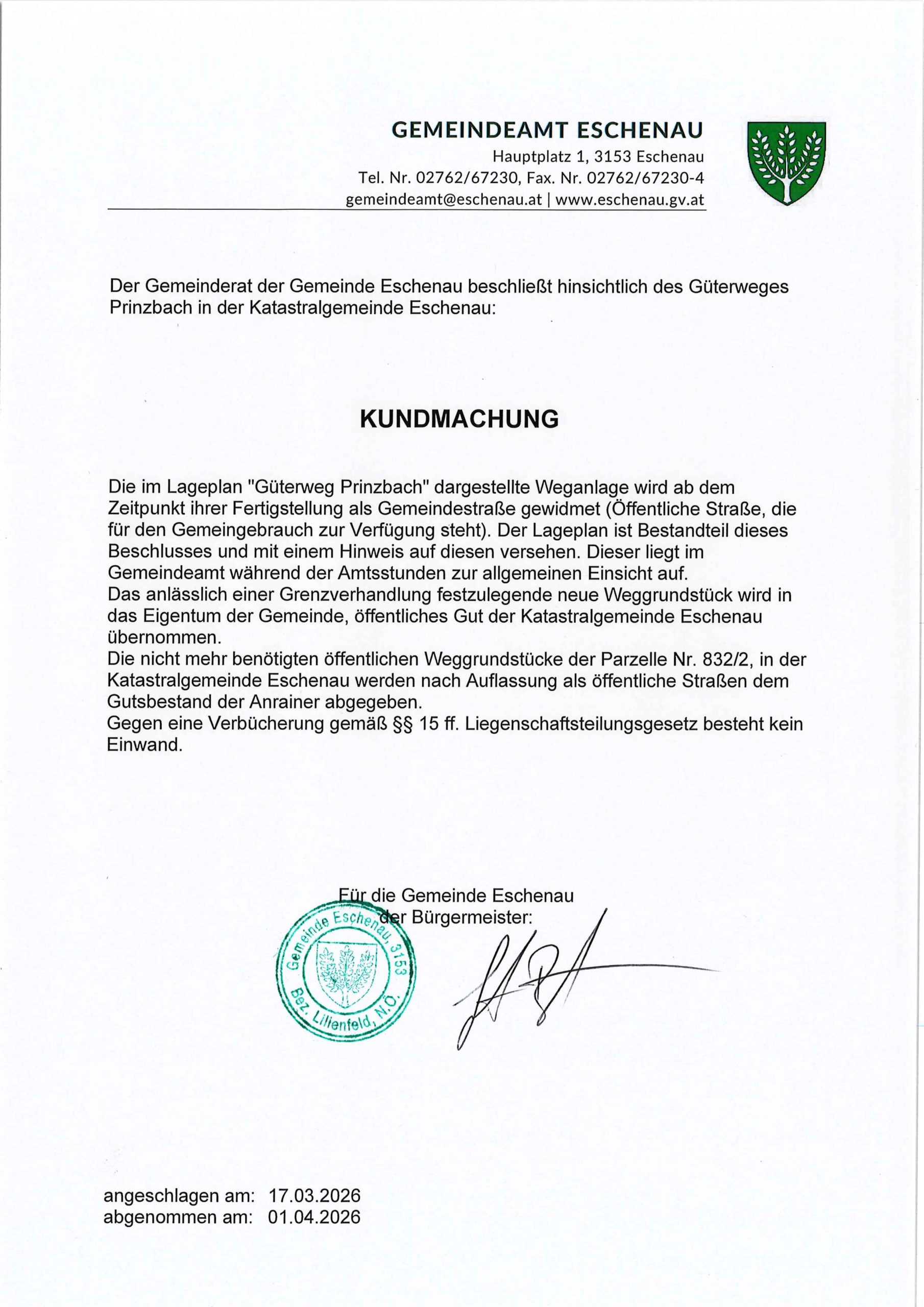 Kundmachung Güterweg Prinzbach